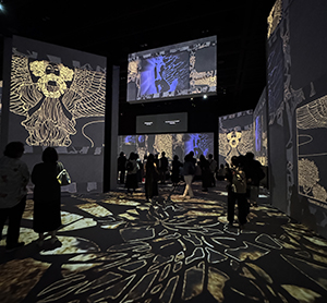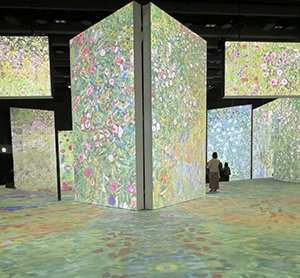 高さ7メートルの大空間に、巨大スクリーンが何台も設置され、クリムトの傑作「接吻」「ユディト」「死と生」をはじめとする数々の絵画が、魅惑的なストーリー仕立てで映し出されていきます。光、色、音、香りに包まれた映像は、まさに圧巻。巨大な空間に流れるクラシック音楽と香りに身を委ねながら、クリムトの華やかで耽美な装飾美を堪能できました。