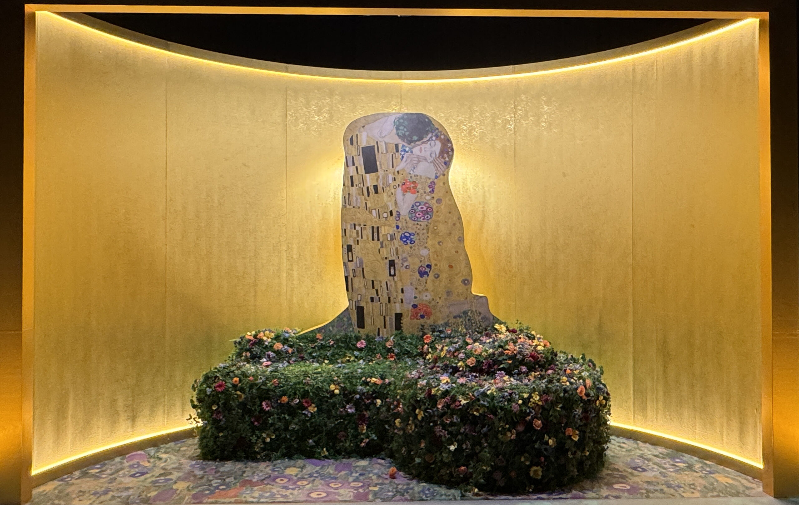 「接吻」の黄金と花のベンチシートでは、お花のベンチに腰掛けての撮影も可能でした。